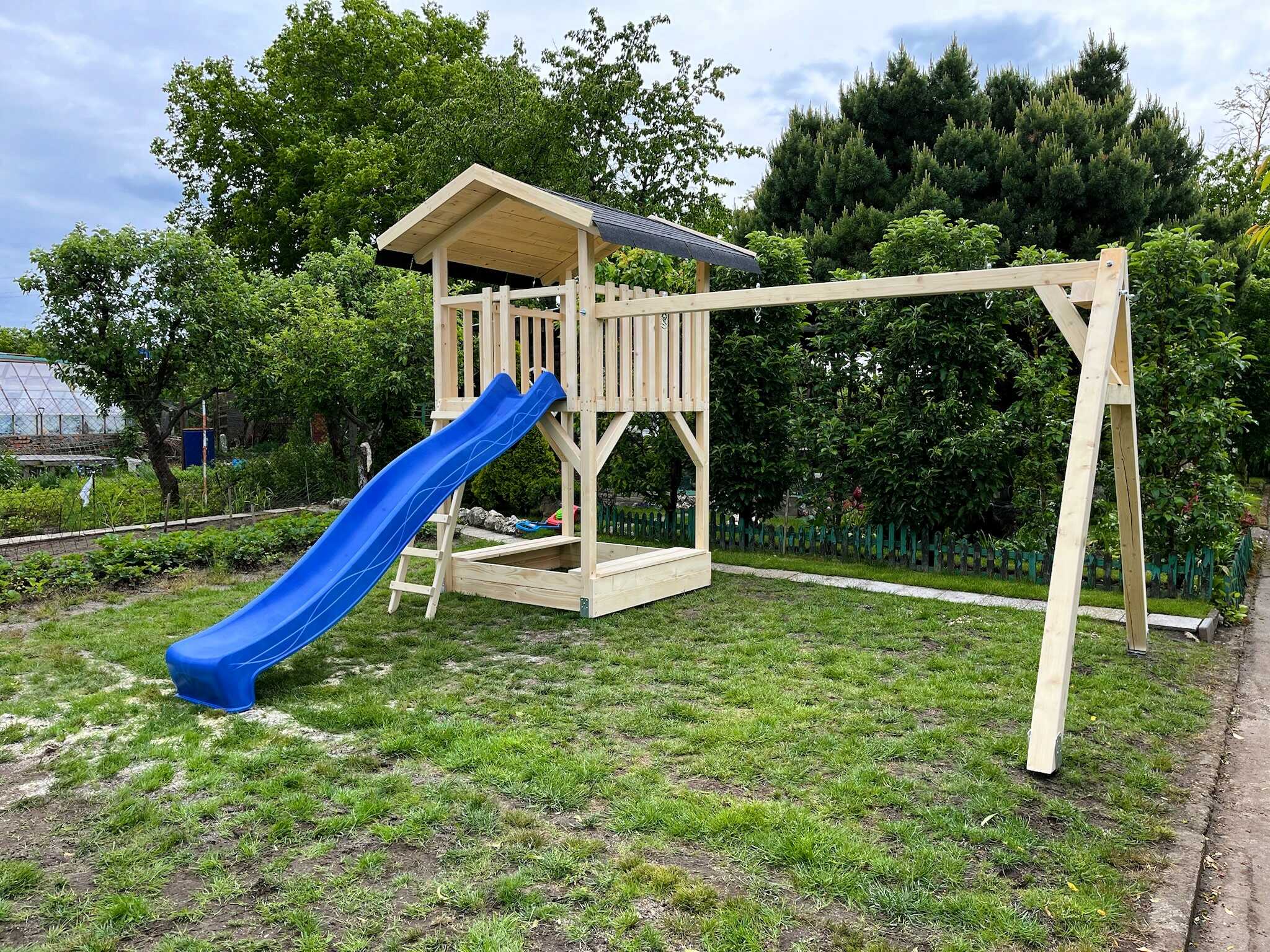 Půdorys domečku je 150×150 cm a délka houpačkového modulu je 300 cm. Hřiště můžeme vyrobit jak z trámů o síle 10×10 cm – s nosností 150 kg, nebo 8×8 cm s nosností 80 kg. Šířka „áčka“ je 250 cm a zajišťuje tak maximální stabilitu a bezpečnost při houpání. Skluzavku standartně montujeme ve výšce 150 cm, ale vše se odvíjí od profilu a terénu Vaší zahrady. Celkový půdorys (bez skluzavky) je 250×450 cm. Na Vaše přání je možné jakékoliv rozměry hřiště upravit a přizpůsobit Vašim potřebám.