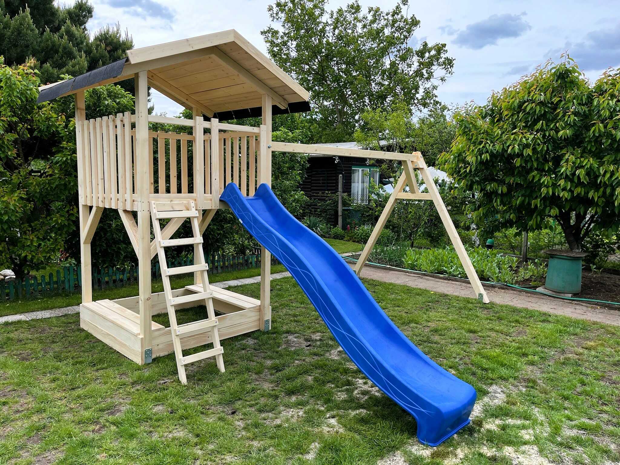 Základní varianta obsahuje vysokou věž se zábradlím, na kterou se děti dostanou pomocí žebříku. Součástí hřiště je pískoviště bez krytu a na věž navazuje pevný houpačkový modul určený pro dvě závěsné houpačky. Konstrukce je zhotovena z hranolů 8×8 cm.