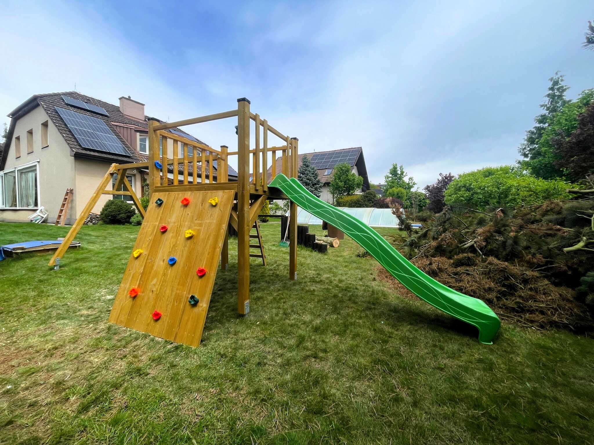 Podporujeme české dodavatele – veškeré dřevo, skluzavky, houpačky a spojovací materiál nakupujeme výhradně v Česku. Hrany masivních trámů ofrézujeme a obrušujeme do hladka, aby byly příjemné na dotek a minimalizovalo se riziko zadření třísky nebo jiného poranění. Vše spojujeme kvalitním materiálem přímo u Vás na zahradě, čímž zajišťujeme maximální bezpečnost a dlouhodobou stabilitu.