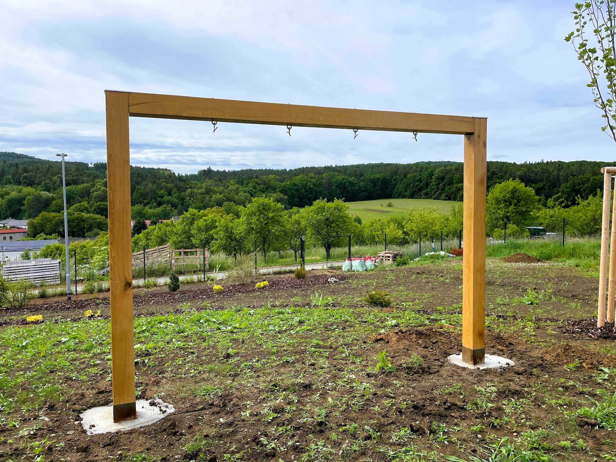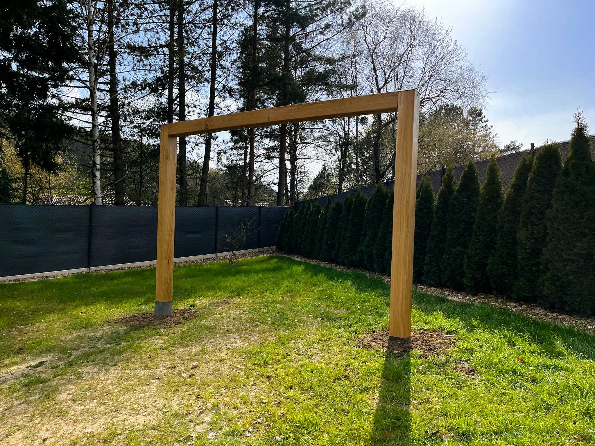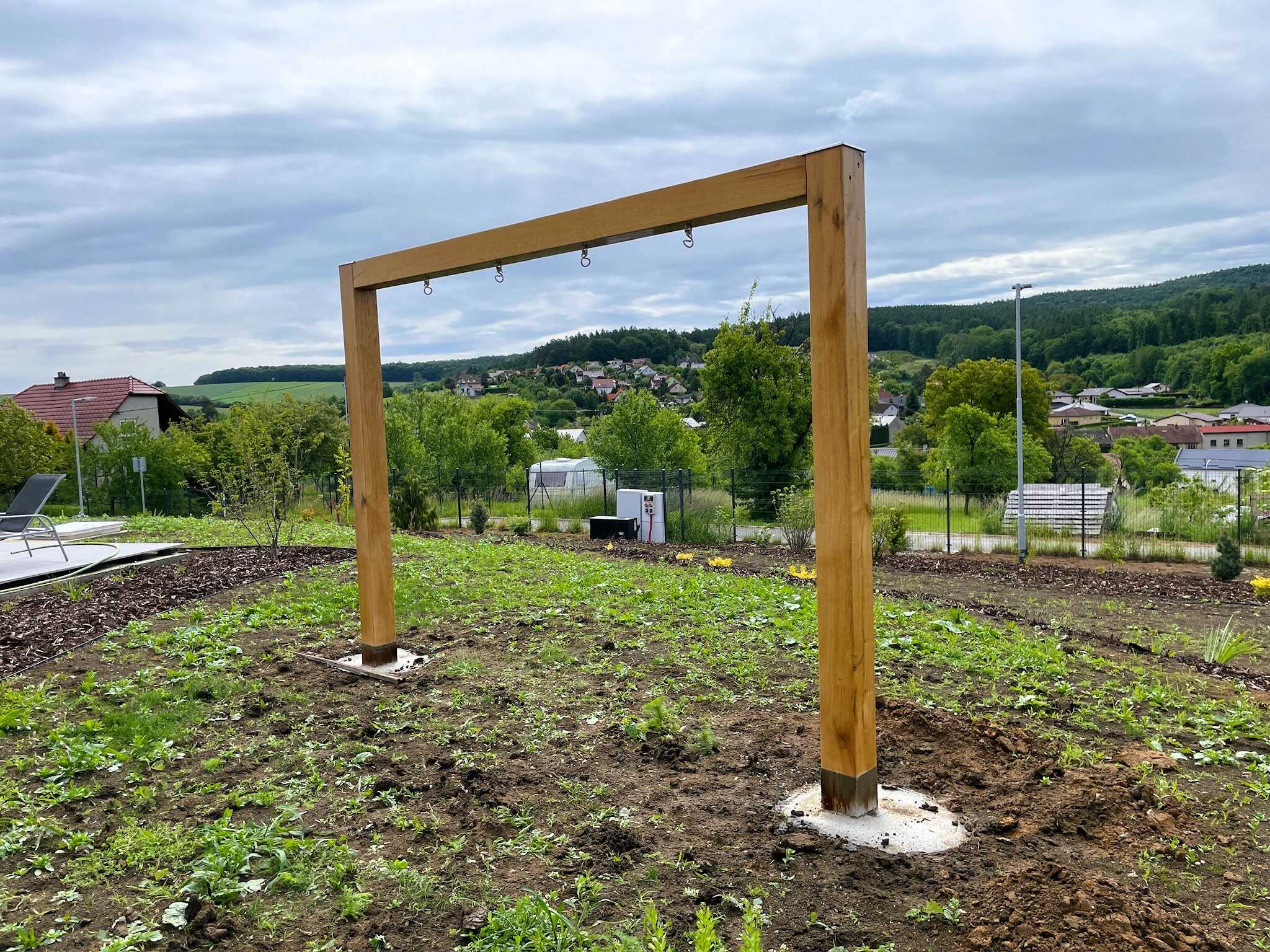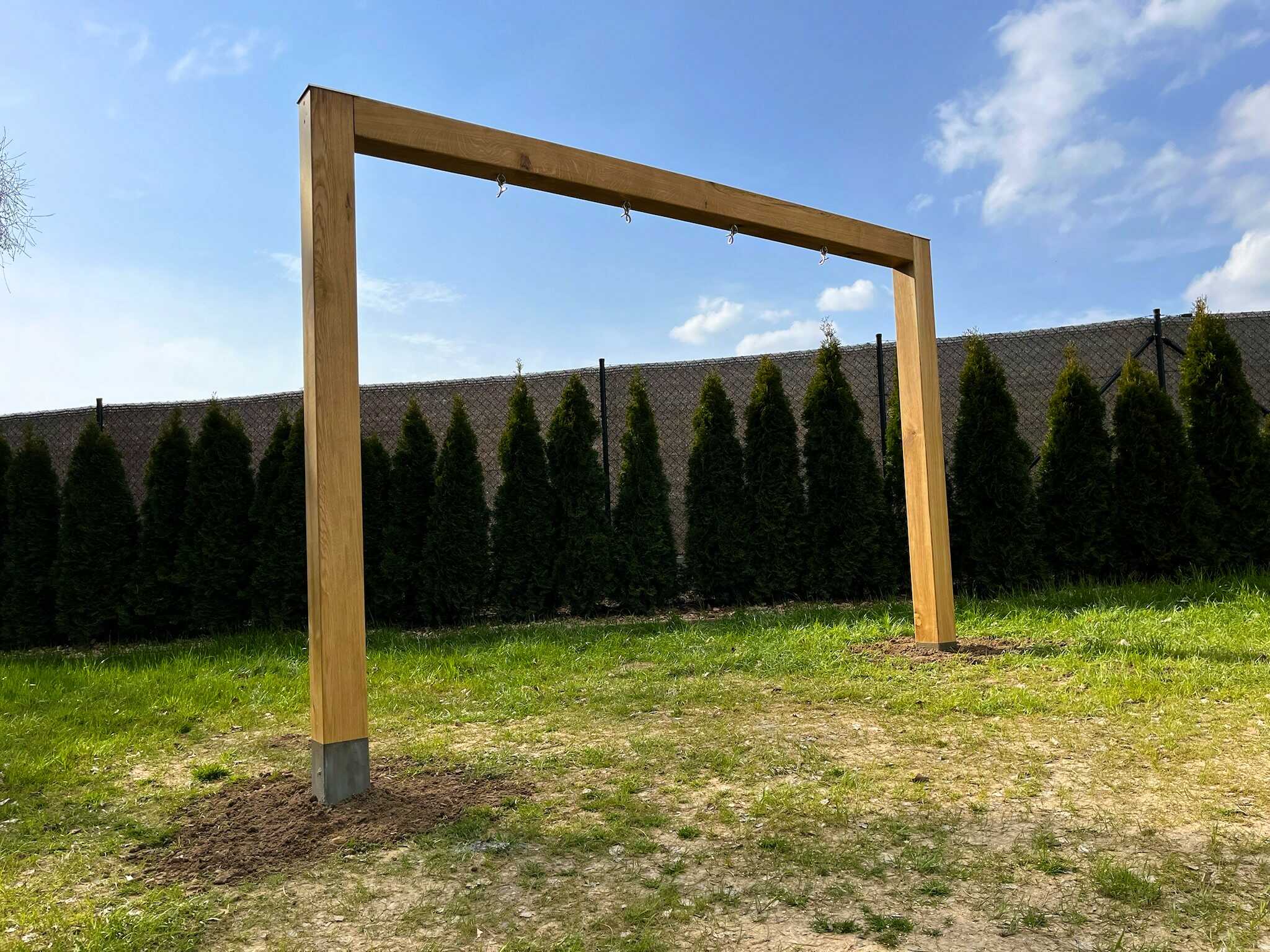 Konstrukce je vyrobena z hoblovaných dubových hranolů 15×15 cm. Díky betonovému zakotvení je rám maximálně stabilní a bezpečný při každodenním houpání. Na Vaše přání je možné rozměry konstrukce upravit a přizpůsobit Vašim potřebám.