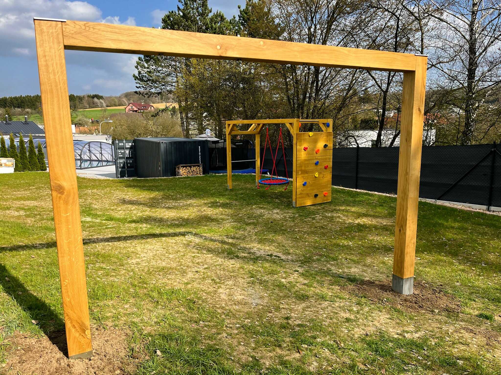 Základní varianta obsahuje samotnou rámovou konstrukci s olejovým nátěrem, kterou si postavíte na zahradě svépomocí. Konstrukce je z hranolů 15×15 cm. Součástí jsou i houpačkové háky a stručný návod.